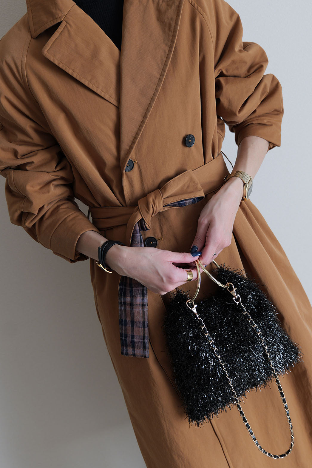 ゴールドの大きなリングとロングチェーンが