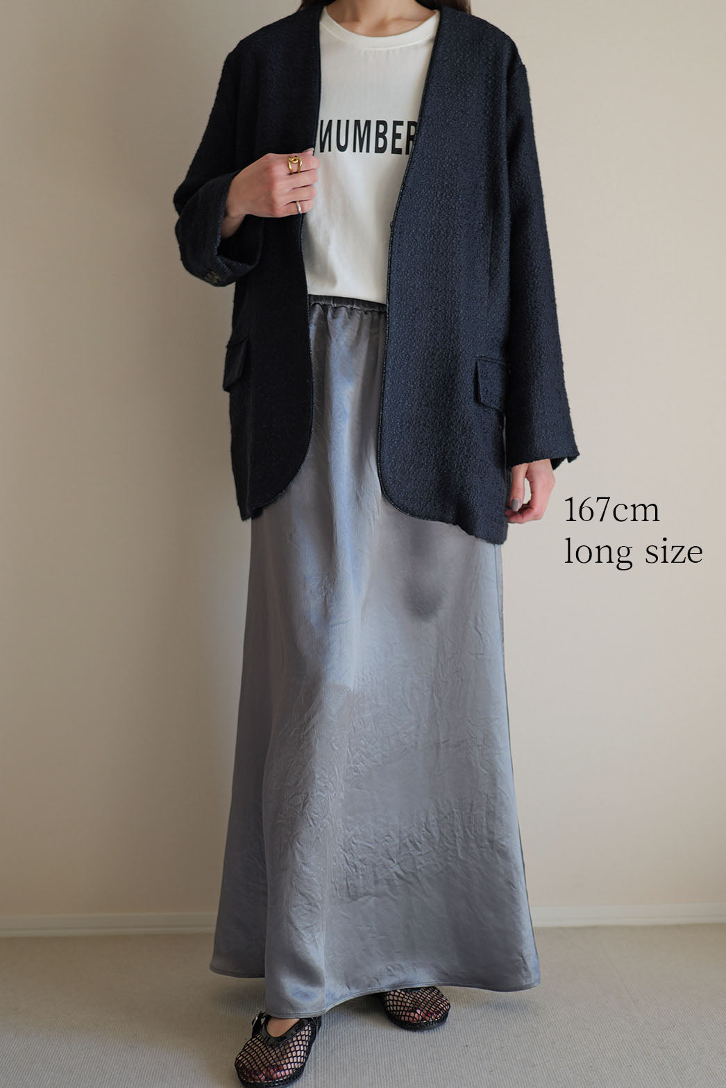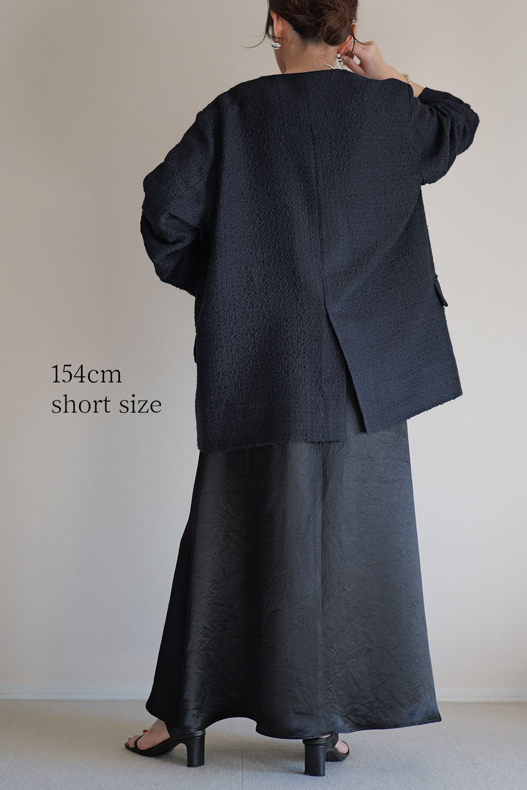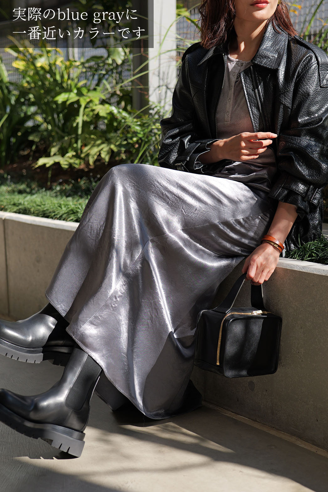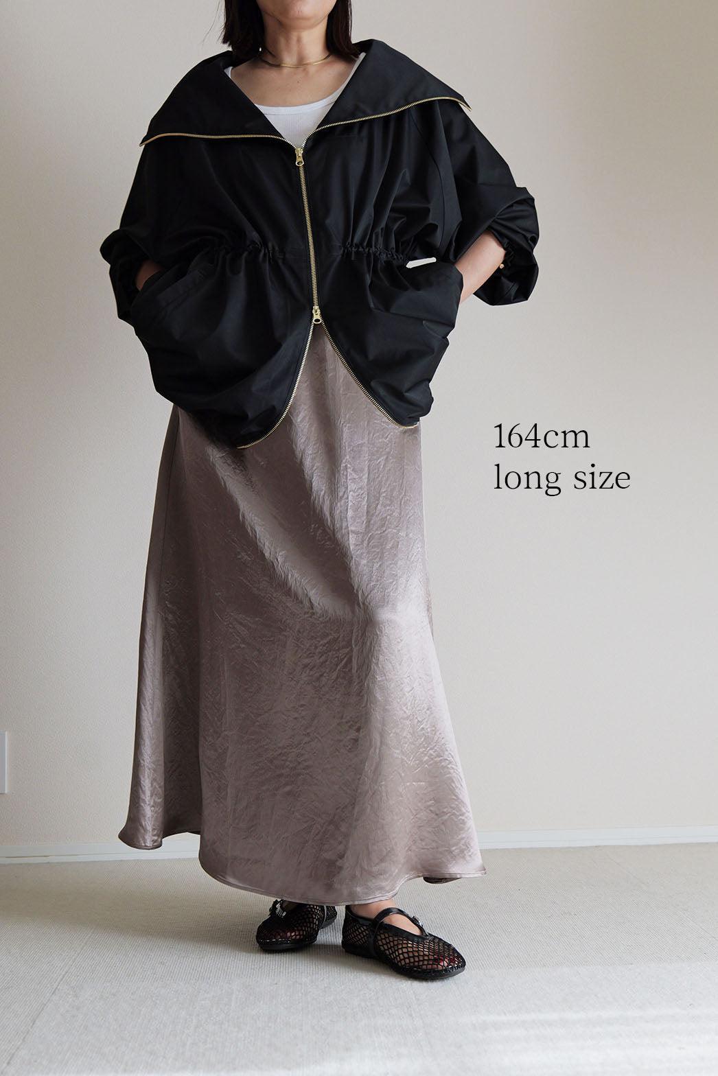 動くたびに陰影の表情が変わり、素材そのものの魅力が際立つ一着です