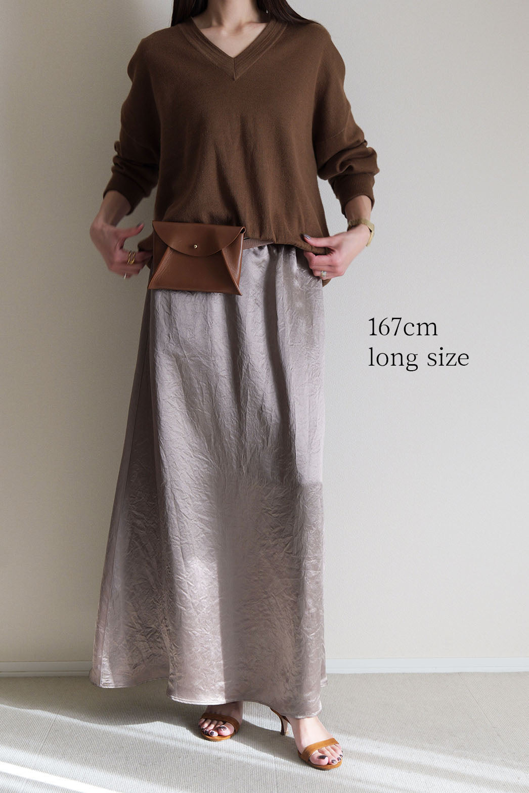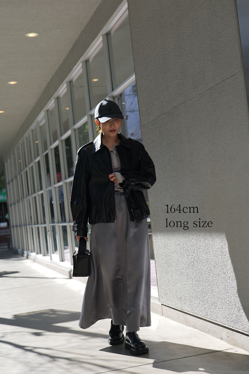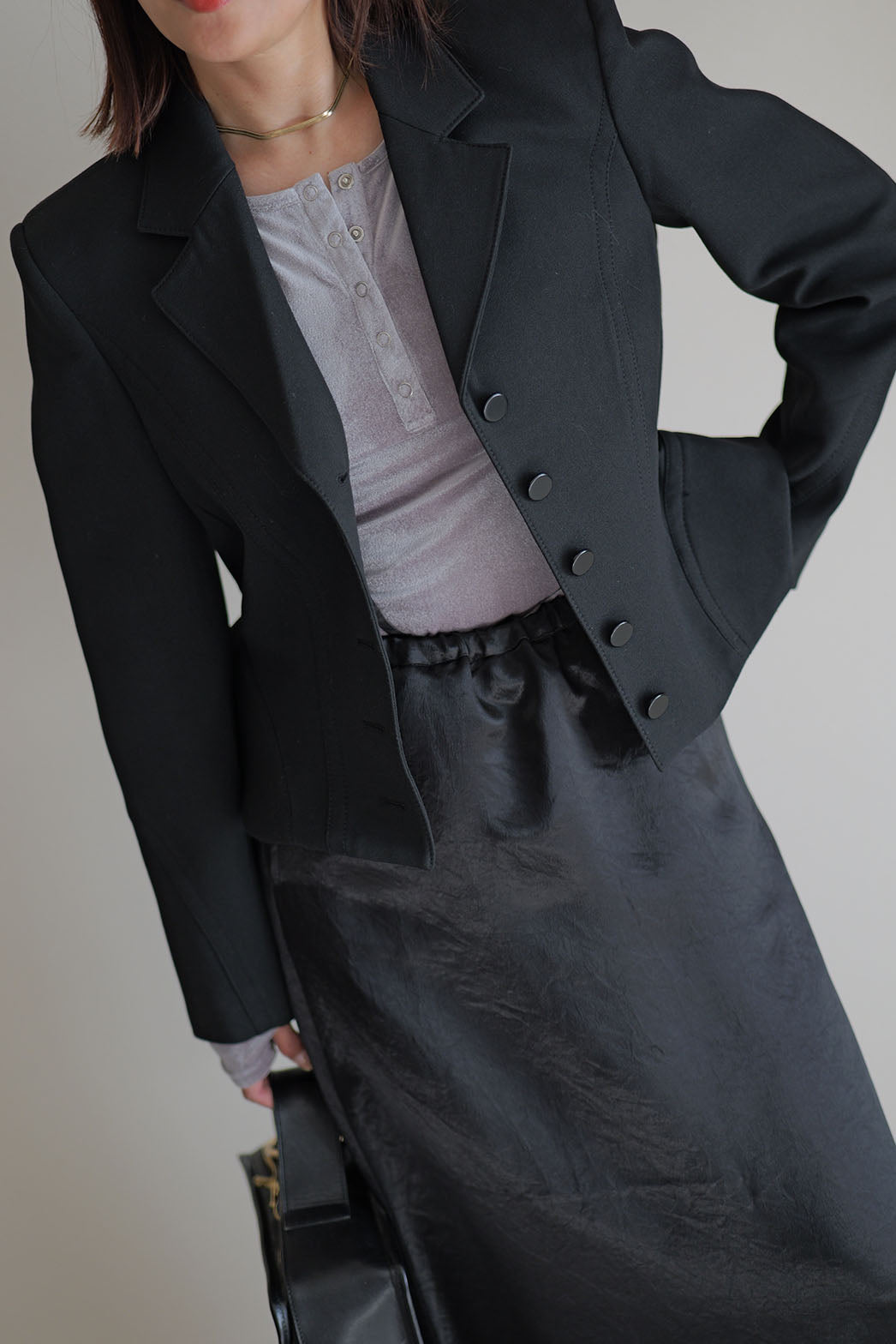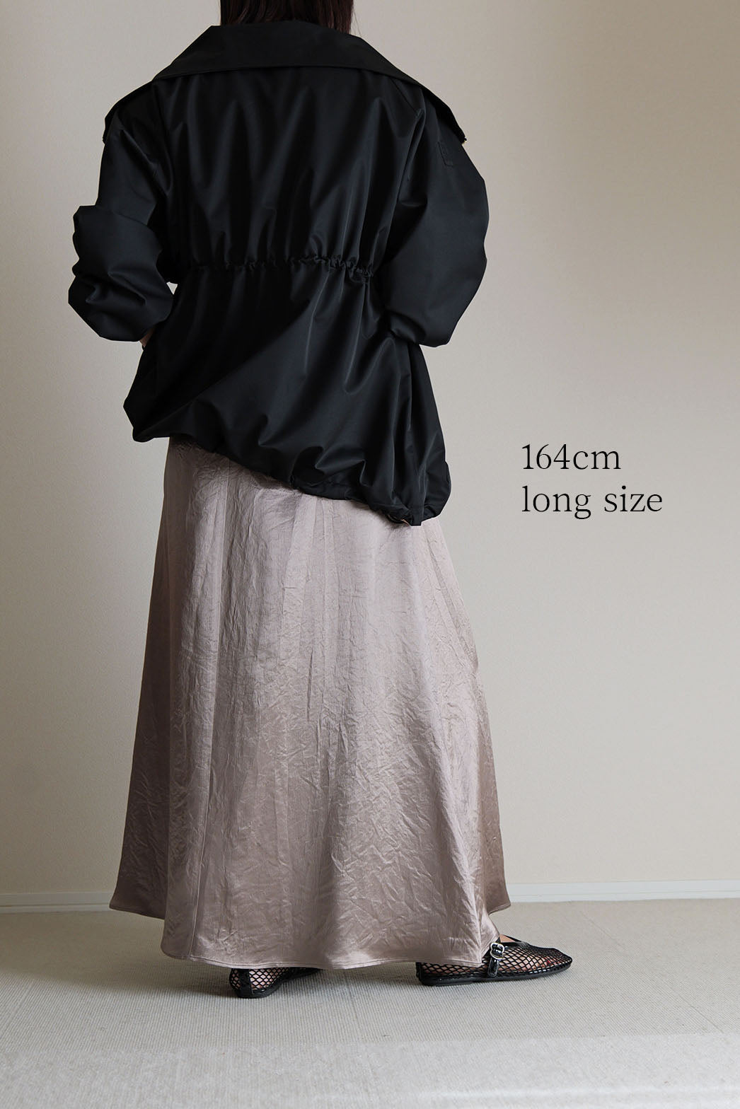 動くたびに陰影の表情が変わり、素材そのものの魅力が際立つ一着です