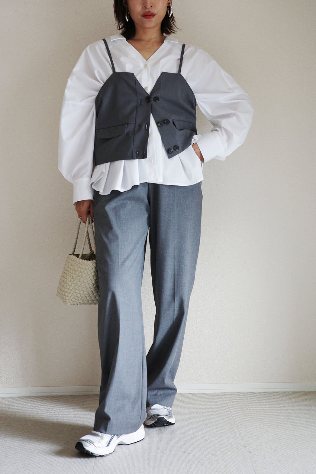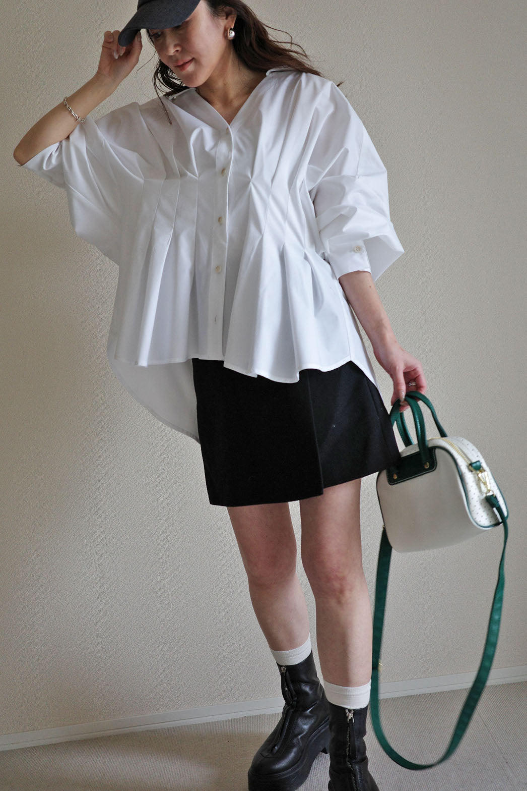 短めのフロント丈がボトムスを長く見せ、脚長効果を演出